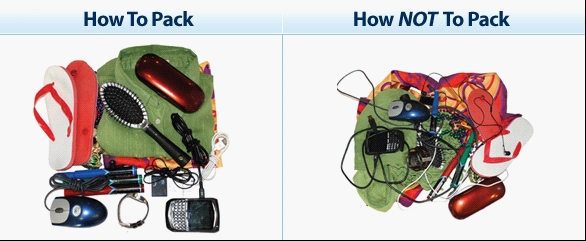隨身行李中物品要分層整理,如圖所示:底部先鋪一層衣物,上面一層放電子設(shè)備,然后再放上一些衣服,最后把較重的物品壓在最上面。如上圖所示,這樣的擺放方式有利于機(jī)場(chǎng)安檢人員對(duì)包內(nèi)所放物品一目了然,不會(huì)因?yàn)榘鼉?nèi)物品擺放問(wèn)題而使你的包包看起來(lái)象是一件危險(xiǎn)品。