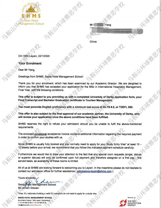 馬鞍山學邦留學:瑞士酒店管理大學offer