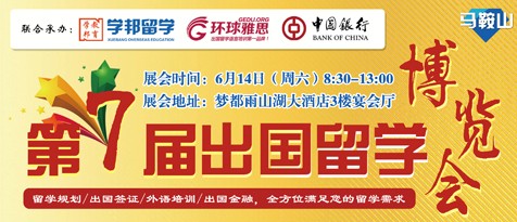 “世界名校云集、留學專家薈萃”—— 6月14日周六上午8:30,由馬鞍山市貿(mào)促會、國際商會主辦,學邦留學、中國銀行、環(huán)球雅思共同承辦的“2014馬鞍山第七屆出國留學博覽會”即將在市夢都雨山湖大酒店3樓隆重舉行。本次展會是經(jīng)市政府相關單位批準,一年一度馬鞍山地區(qū)規(guī)模最大、檔次最高、影響最遠的國際教育盛會。